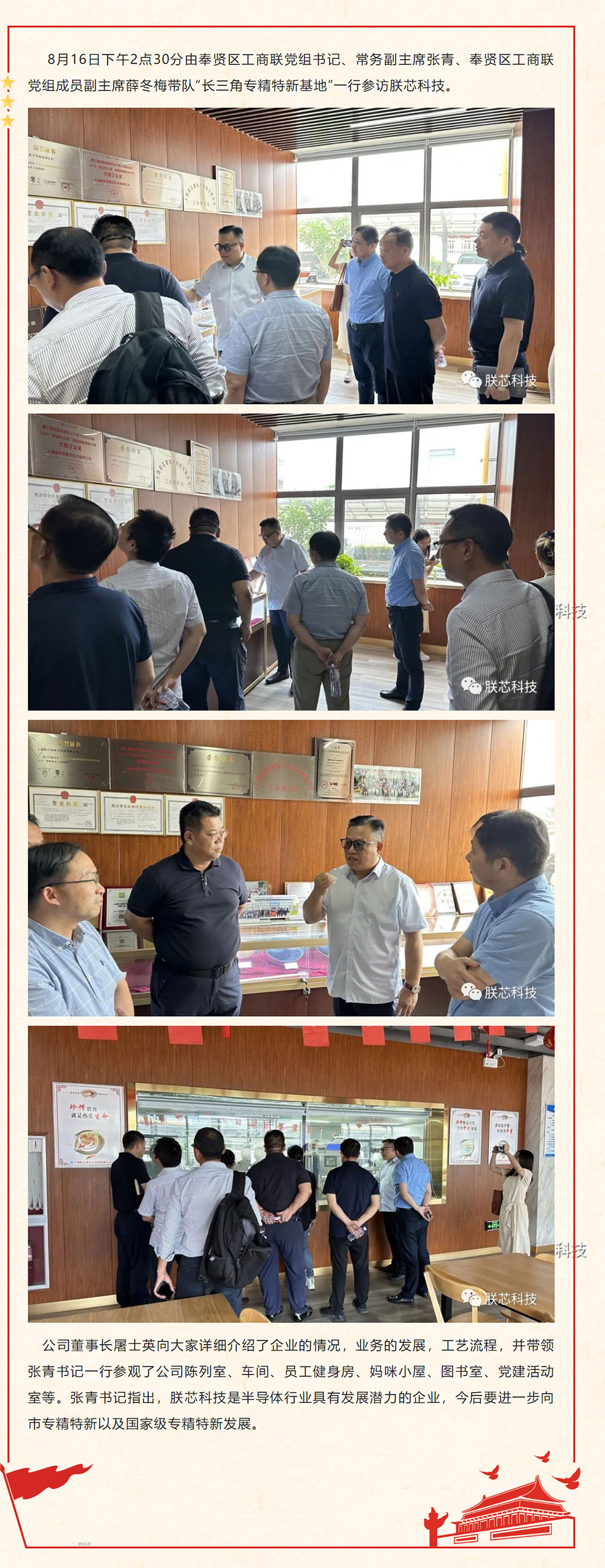 8月16日下午2点30分由奉贤区工商联党组书记、常务副主席张青、奉贤区工商联党组成员副主席薛冬梅带队“长三角专精特新基地”一行参访朕芯科技。