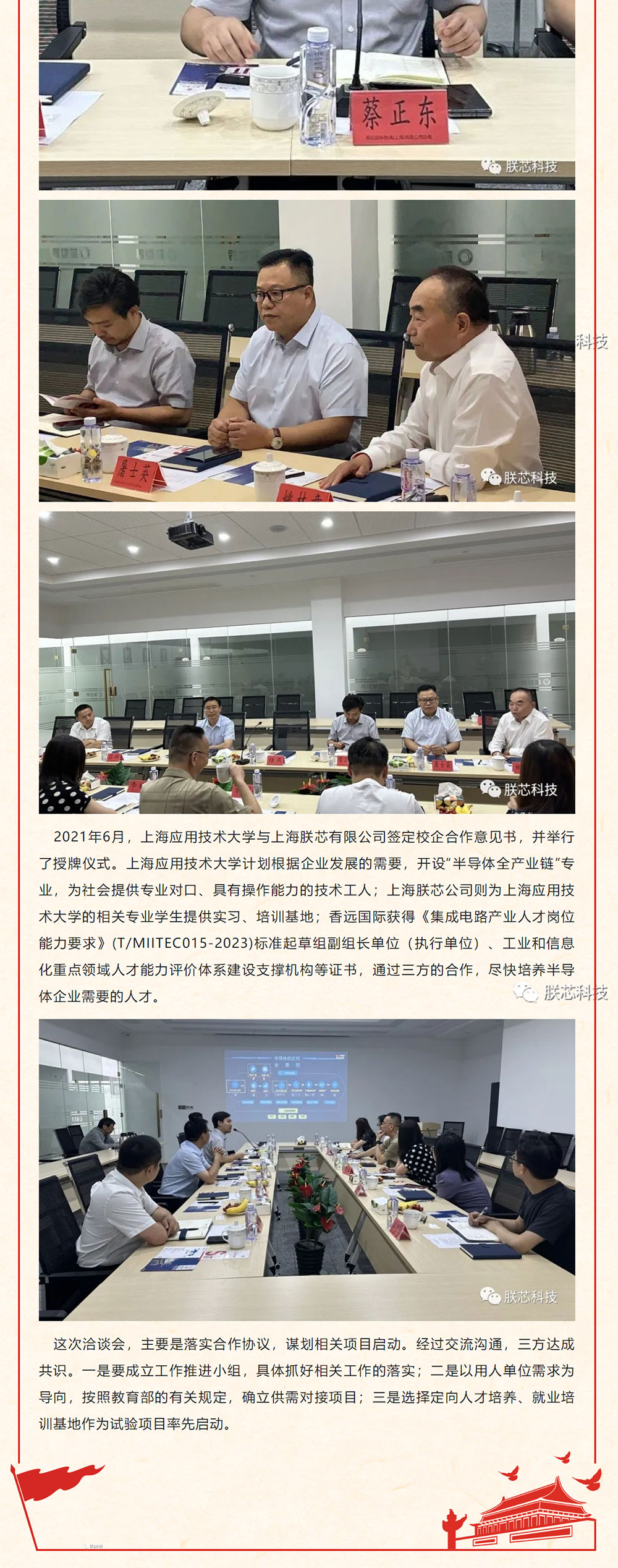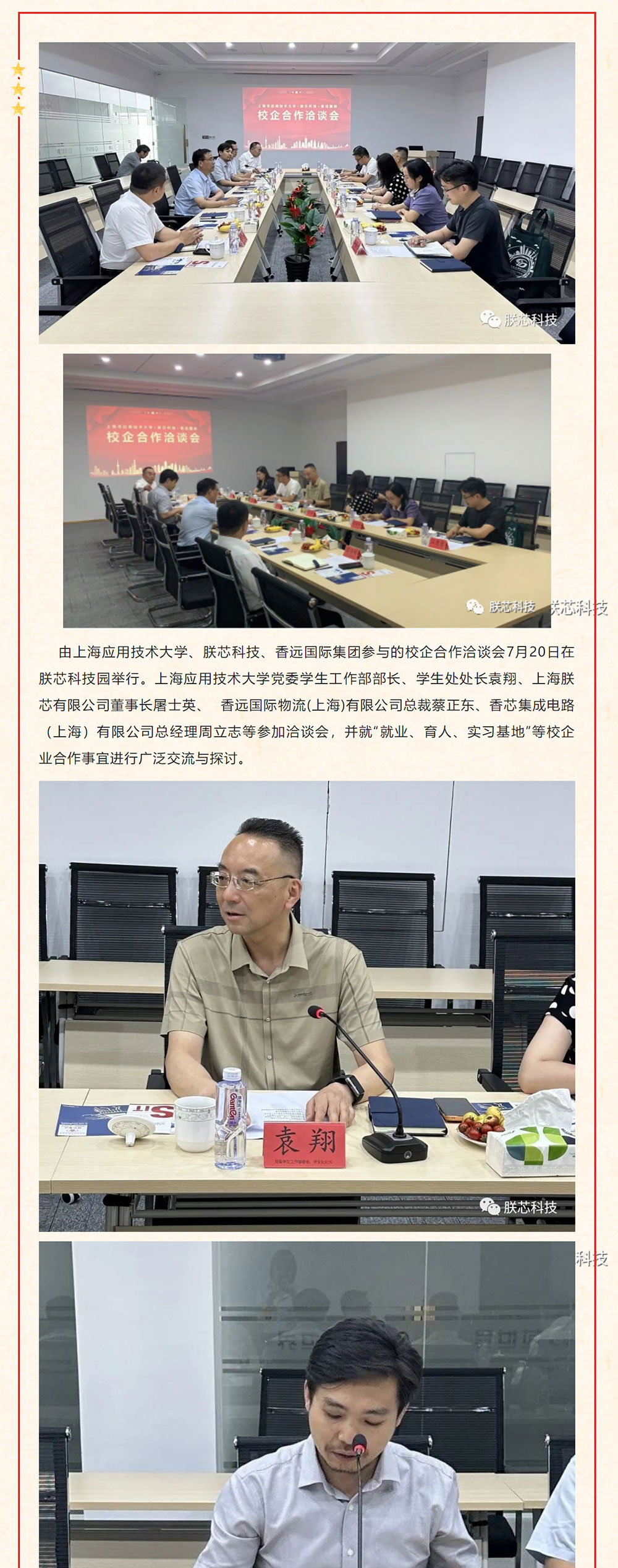 由上海应用技术大学、朕芯科技、香远国际集团参与的校企合作洽谈会7月20日在朕芯科技园举行。