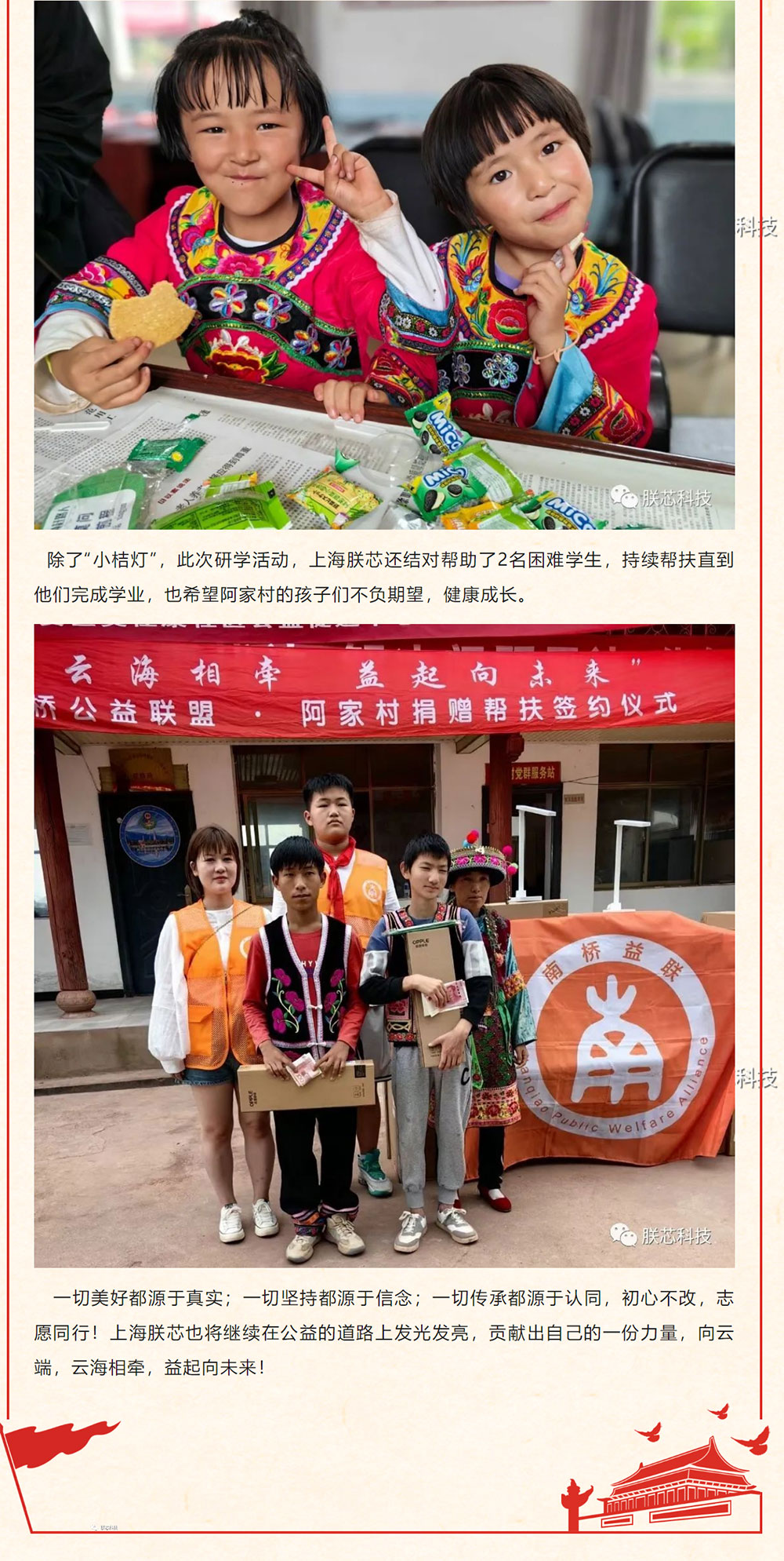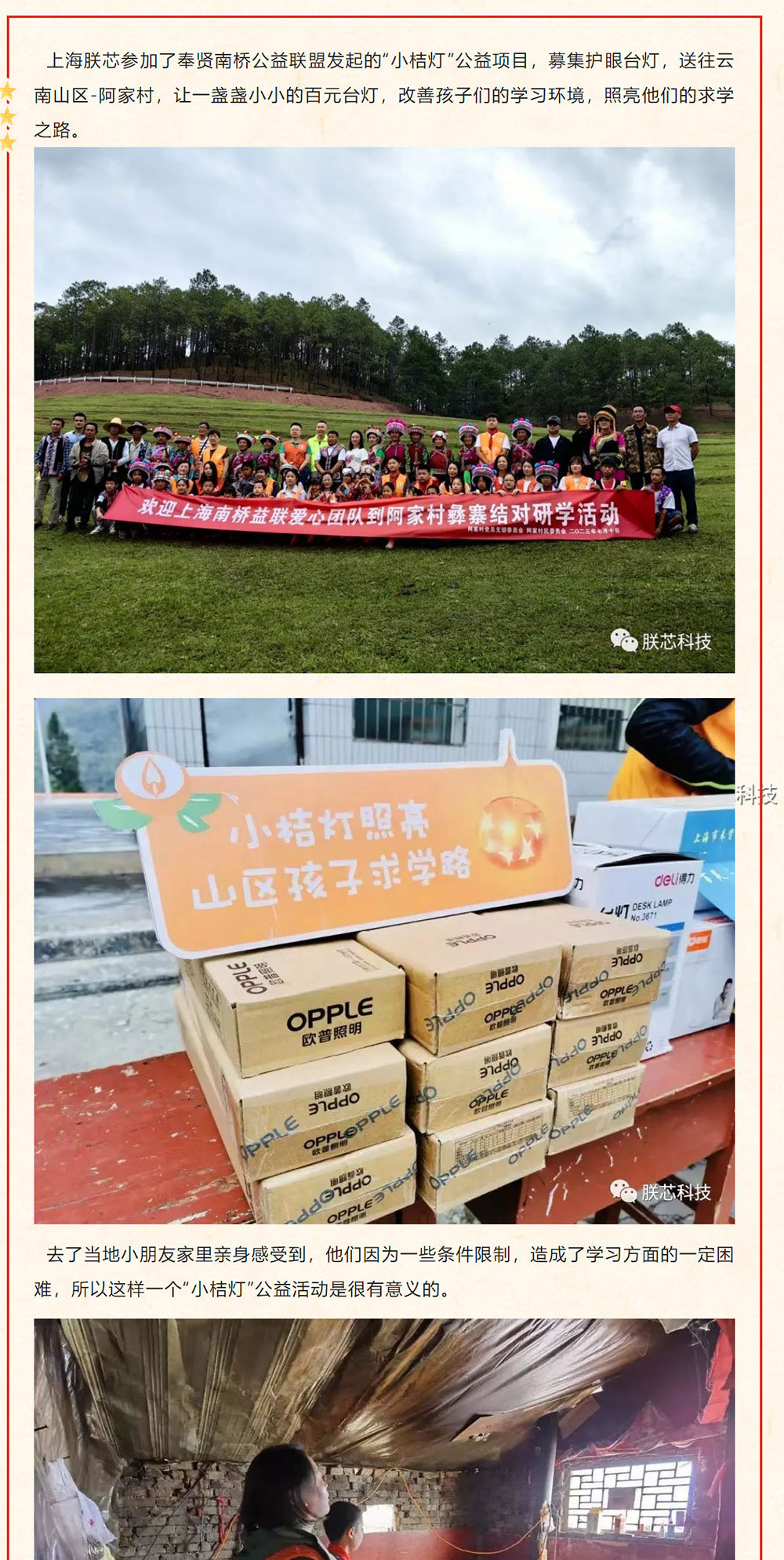 上海朕芯参加了奉贤南桥公益联盟发起的“小桔灯”公益项目,募集护眼台灯,送往云南山区-阿家村,让一盏盏小小的百元台灯,改善孩子们的学习环境,照亮他们的求学之路。